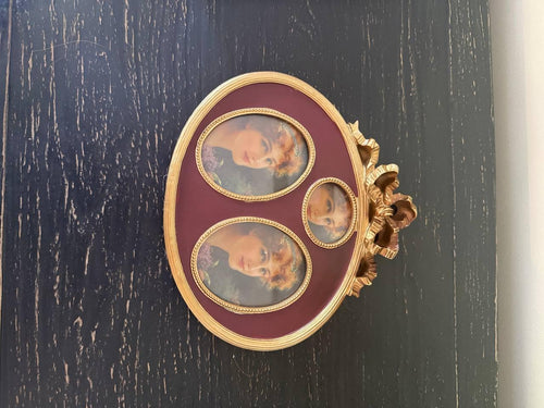 Vintage Wall Decor, Gold Metal, Oval Triple Portrait Display, Ornate Baroque Style, Wall Mount or Tabletop, 20x20 cm